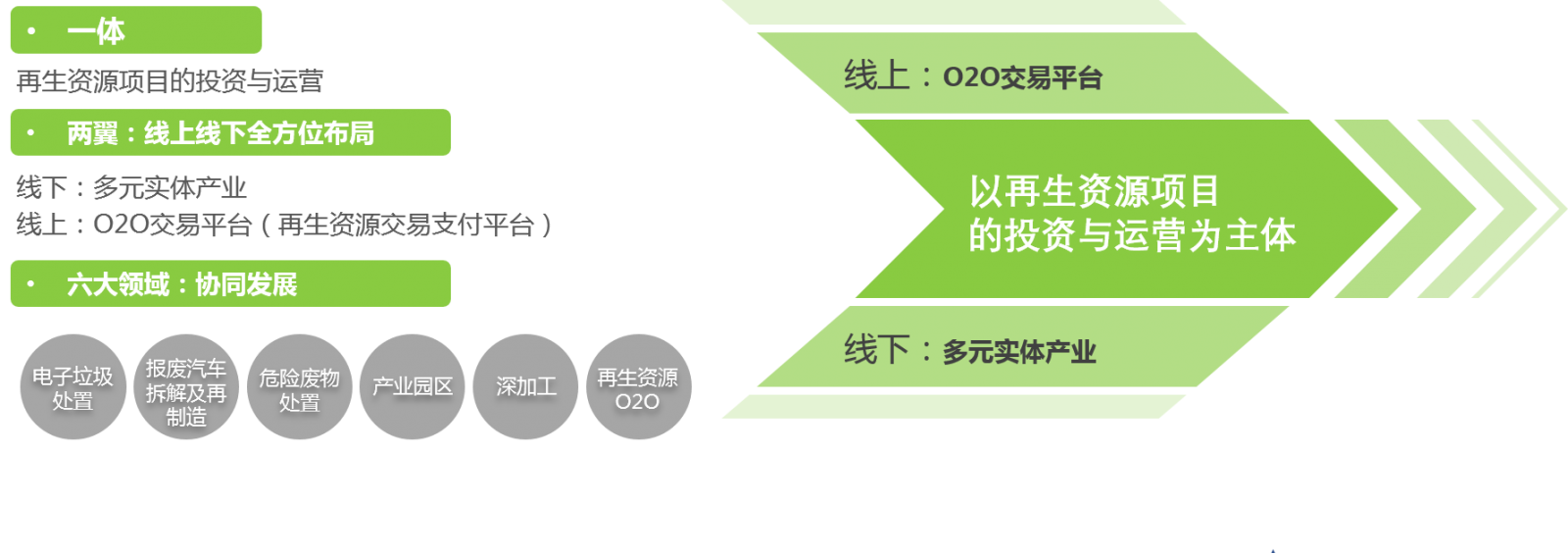 以再生資源項目的投資與運營為主體,以線下多元實體產業和線上易再生O2O交易平臺為兩翼,在六大領域謀篇布局。