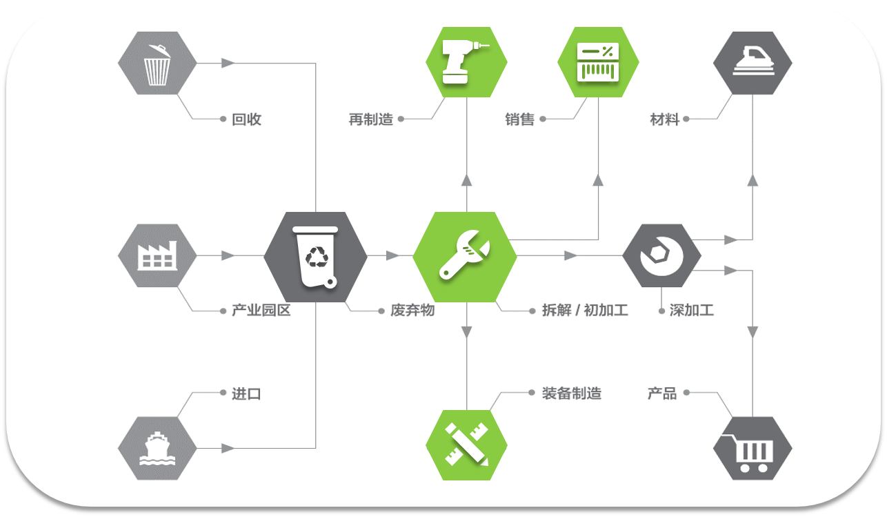 實體產業涉及電子垃圾處置、報廢汽車拆解及再制造、危險廢物處置、產業園區運營、深加工等,形成了覆蓋回收、初加工和深加工全產業鏈的大格局。其中,旗下電子垃圾處置企業11家,年資質拆解能力達到2020萬臺,位居行業首位。同時,積極響應國家“互聯網+”戰略,創新產業商業模式,打造易再生O2O交易平臺,力推產業公社模式,構建分工協作、互利共贏的產業聯合體,全方位滿足用戶需求,被中國電子商務協會授予“B2B行業標桿企業”榮譽稱號。
